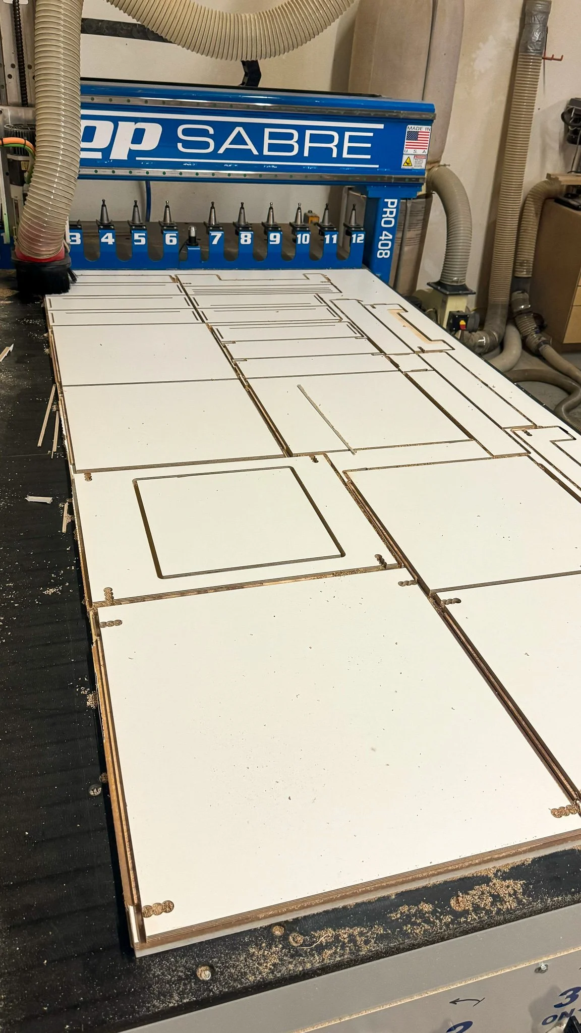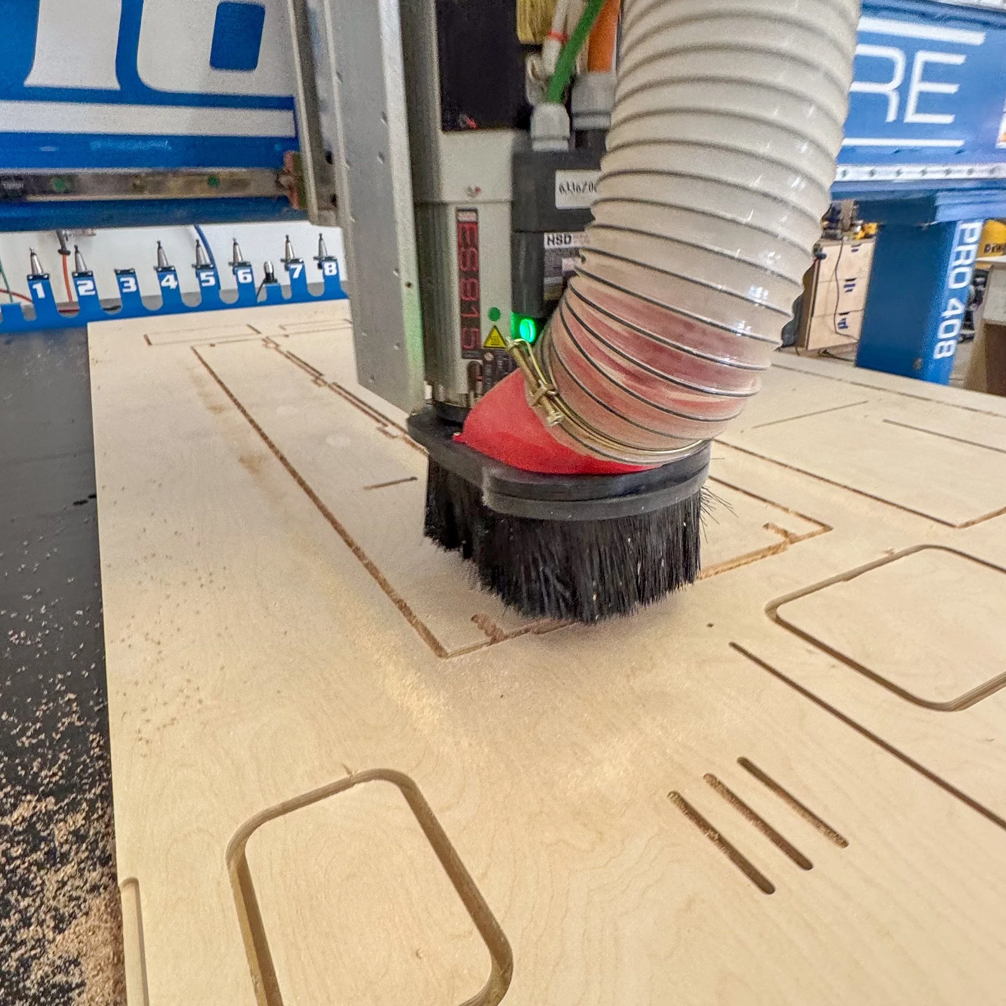 Our ShopSabre 4'×8' CNC router cuts plywood, plastic sheet goods, and composite panels with precision and repeatability. With a 12-position automatic tool changer and vacuum hold-down, we go from file to finished parts - no jigs, no clamping, no babysitting.